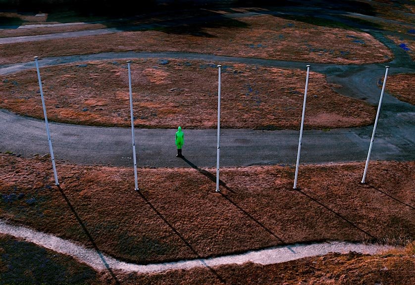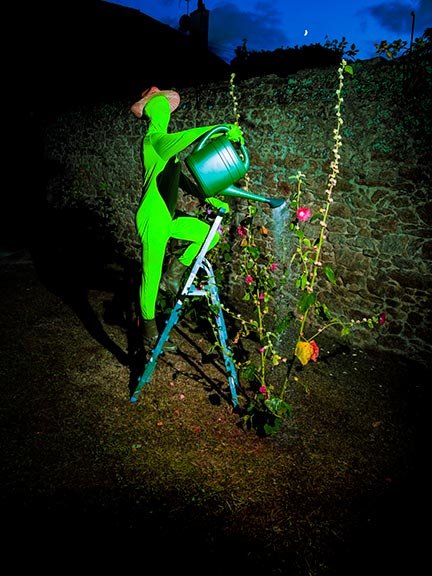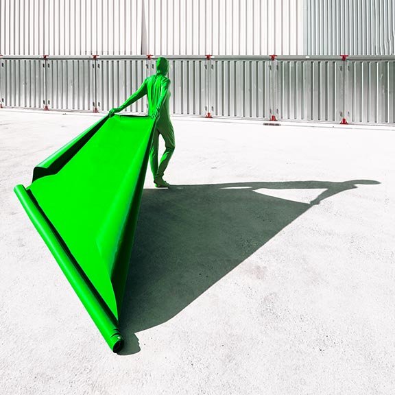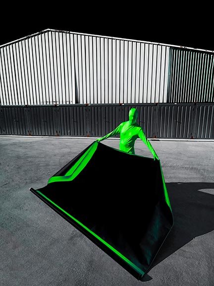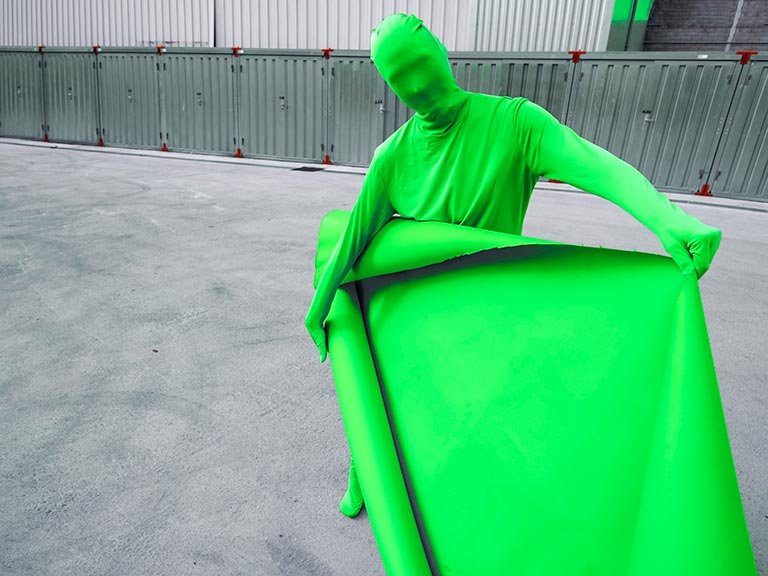 Le fond vert, omniprésent dans le cinéma. Le green keeing, technique sur usité dans le milieu de la production visuelle et des arts visuels au XXIième siécle. Le fond est remplaçable, l'humain aussi. Le personnage vert n'est pas un personnage, il est l'expression de toute la poésie de la vie humaine et de son environnement.